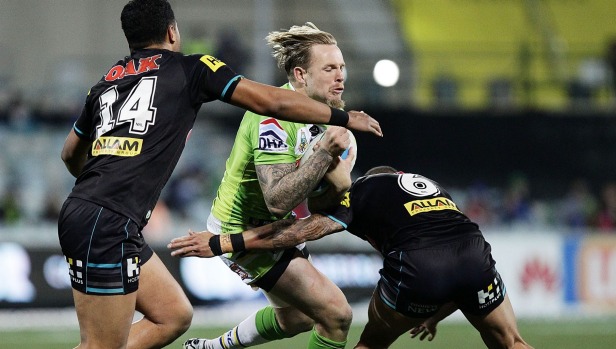 It was clear early on that two things were going to happen this game. The Panthers were going to attack the Raiders right edge defence, and the Raiders were going to attack the Panthers around the ruck. The Panthers seemed to have the best of the running in the first five minutes, sending their attacking exclusively at Blake Austin and Brenko Lee on the right. The Raiders defence held, but hardly seemed rock solid in the face of some fairly side-to-side work by the Panthers.