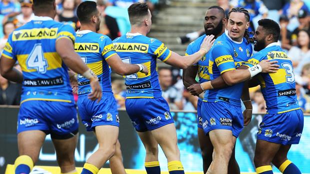 For the next five minutes, the Eels faced an unrelenting challenge from the Tigers. Wests marched down field with ease from the kick off, with their forwards putting the Eels on the backfoot. Tedesco and Mitch Moses probed the disjointed line looking for the killer blow. A penalty, followed by a repeat set, meant Parramatta were forced to defend for their lives on their own line. Having been moved from one edge of the field to the other, there was a visible shift in mood when the Eels were able to see off the challenge.