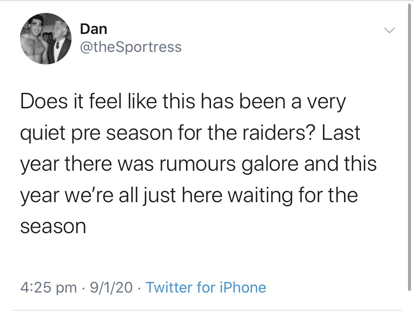 Local Raiders fan, Dan, told the Sportress that he couldn’t remember a summer as quiet as this one for the Green Machine.