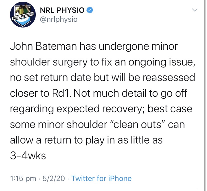 Fortunately there’s every indication Bateman will be alright for round 1 *crosses fingers, knocks on wood, prays to Badge’s moustache*. The Raiders have said this injury related to his load last year, and they’d hoped it would resolve with time. They opted for surgery now, presumably the latest practical moment that would allow him to be ready for the season. As NRL Physio points out on twitter, shoulder clean outs can often be good to go after 3-4 weeks.