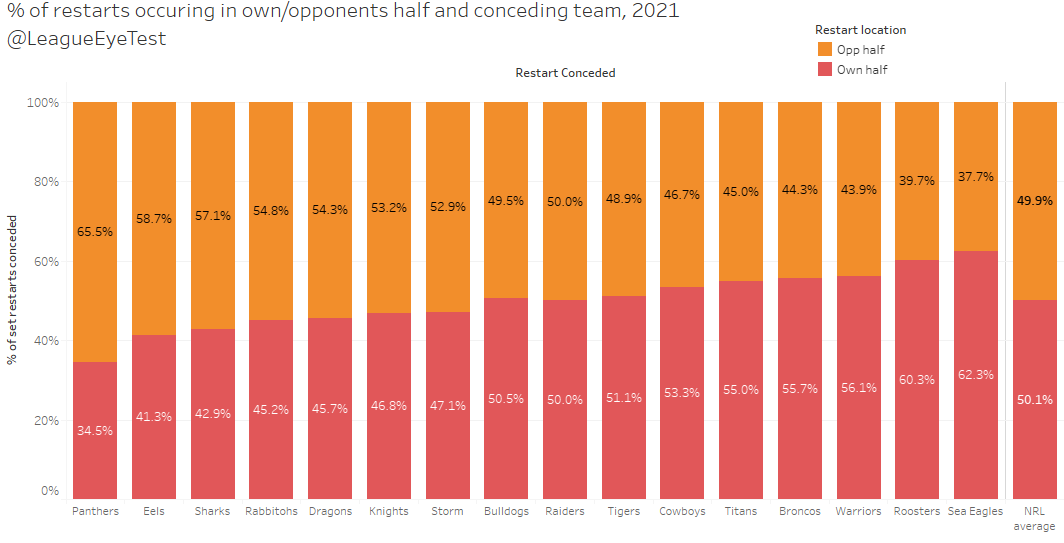 The Raiders were at the other end, one of the teams that didn’t concede many set restarts in their opposition’s yardage sets. You’ll find a heap of measures around, but here’s one from the always tremendous Rugby League Eye Test that splits location by halves. It shows the Milk smack bang in the middle. It’s not hard to see something in common among the worst offenders, with 6 of the top 8 more likely to concede in the opposition half than in their own. I’ve seen other version that have Canberra even more towards the ‘not exploiting the rule’ end. Safe to say the Green Machine were a side either not able to, or not thinking of, exploiting this rule.