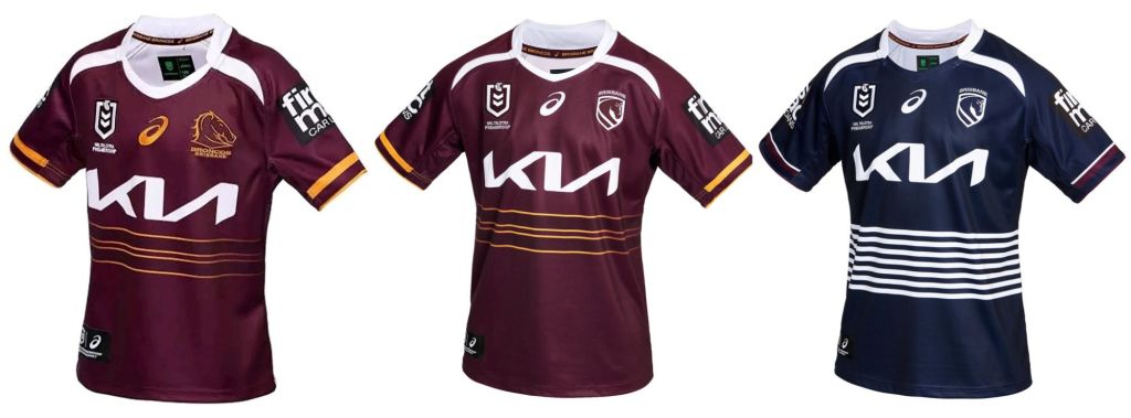 The reigning premiers have made a few subtle changes this year. The inverted white horns coming down from the collar have been narrowed and extended slightly, whilst the ASICS logo and the Broncos new chess-style insignia are rendered in white instead of the classic gold hue. Perhaps the biggest change is the away strip – after last year’s bizarre PE Teacher getup the Broncs have opted for a minimalist flat dark blue design.