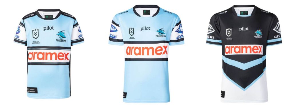 The Sharks too have made only minor tweaks. They’ve deleted the black bars running from the collar to the shoulders, and the bars bordering the main sponsor have been simplified to two black lines. The pilot logo has been brought down to be roughly in line with the NRL and club branding, which in turn helps to open up the visual area of the upper torso. Streamlined, like a shark.