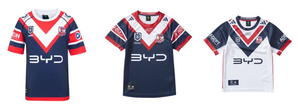 Of all the clubs the Roosters have been the most reticent to unveil their new strip, to the point where the only decent photo of their away jersey is of the infant/junior sized apparel. On the home side of things there have been alterations. The red hem is gone and the cuffs have been reduced. The sleeve sponsor has changed from one interminable firm to another.