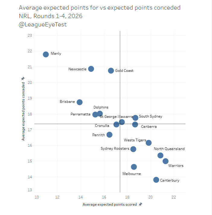 As much as it pains me to admit, this is probably the best approach. This team is not playing well right now, and the outcomes and outputs are obvious. But maybe they are not as far off as we think. If you look at this from the Rugby League Eye Test, the Raiders expected points scored is better than most, and their expected points conceded bang on the median.